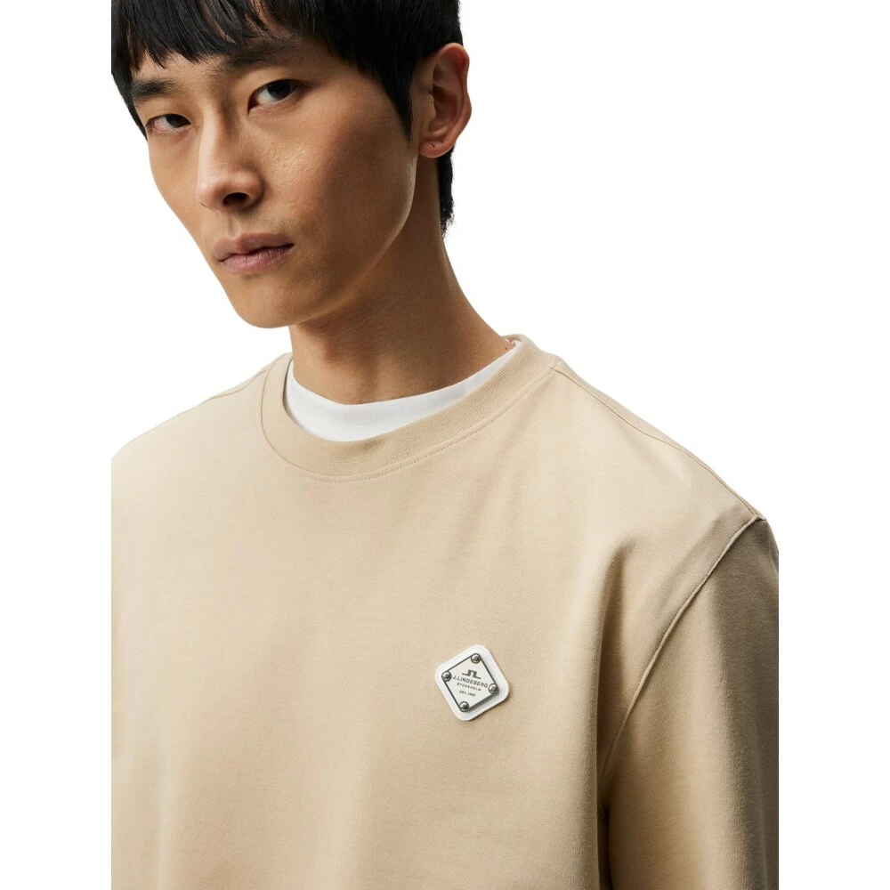Fra J.Lindeberg kommer Creed interlock crew neck I en nydelig Safari beige farge. Stilren bomullsgenser med detaljert diamant-formet logo pÄ brystet. 100% bomull Ribbestrikket i falden, ermene og i halsen Rund hals Normal passform Maskinvask